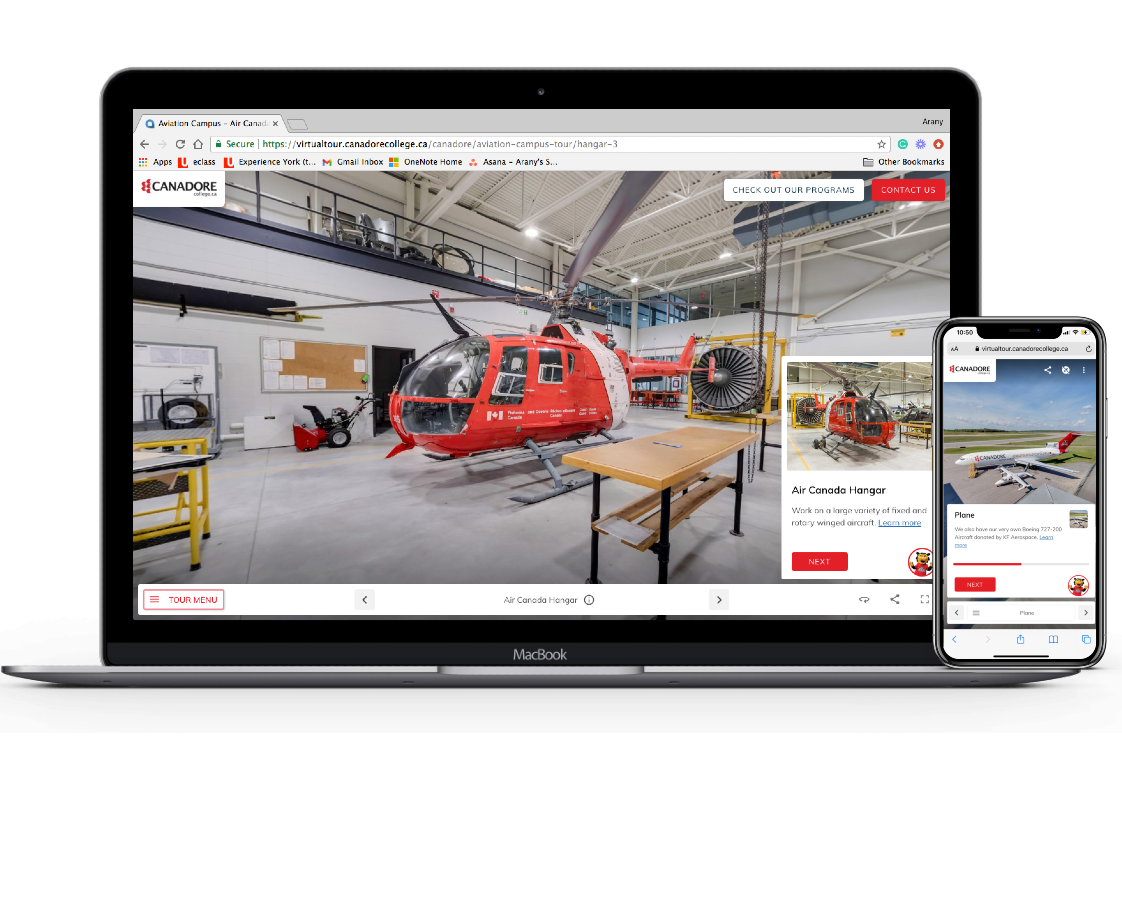 On their program webinars, Canadore College used their Aviation campus tour extensively within the presentations. Prospective students interested in beginning their careers in Aviation could check out the aircrafts, hangars, and read about the different programs and admission requirements.