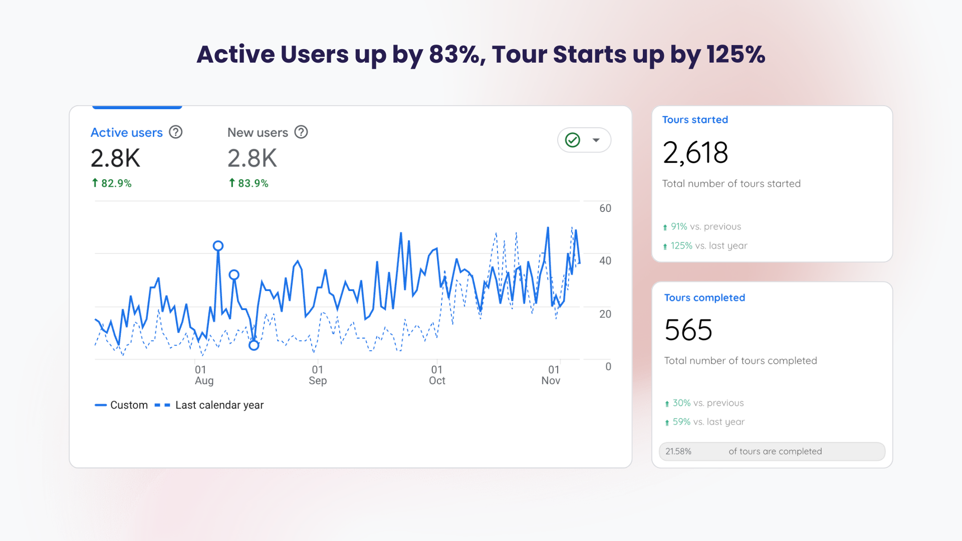 Immediately after the July 7 launch, visitor traffic, sessions, and tour starts doubled. Four months on, that momentum hasn’t slowed—users are up 83% year-over-year and tour starts are up 125%.